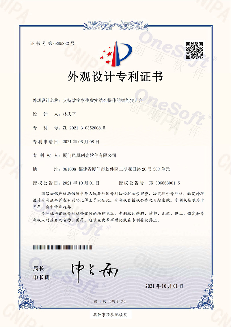 鳳凰創(chuàng )壹智能實(shí)驗臺 (外觀(guān)設計專(zhuān)利證書(shū))
