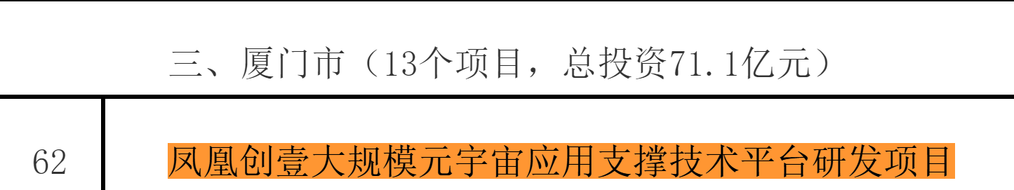 近日,根據省政府工作部署,為深入開(kāi)展習近平新時(shí)代中國特色社會(huì )主義思想主題教育,持續拓展“深學(xué)爭優(yōu)、敢為爭先、實(shí)干爭效”行動(dòng),更大發(fā)揮數字經(jīng)濟重點(diǎn)項目支撐帶動(dòng)作用,進(jìn)一步做大做強做優(yōu)數字經(jīng)濟,經(jīng)部門(mén)地方推薦,省數字辦遴選確定2023年度省數字經(jīng)濟重點(diǎn)項目191個(gè),項目總投資1168億元,年度計劃投資260億元。這是我省首次遴選確定年度數字經(jīng)濟重點(diǎn)項目。廈門(mén)市有鳳凰創(chuàng )壹大規模元宇宙應用支撐技術(shù)平臺研發(fā)項目等13個(gè)項目列入,總投資71.1億元。
