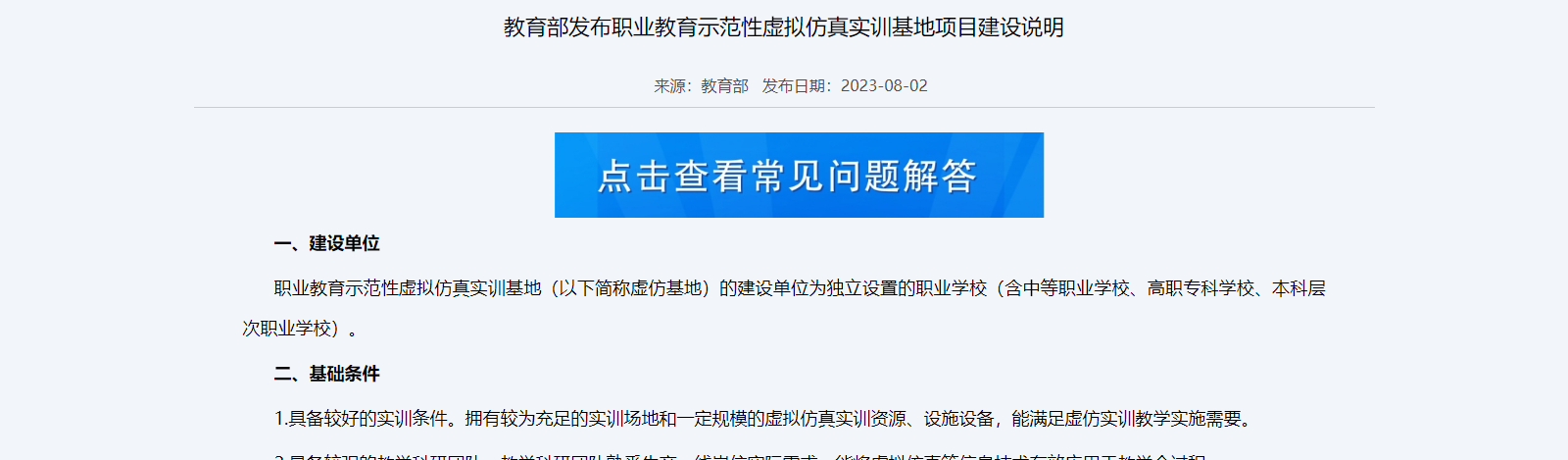 職業(yè)教育示范性虛擬仿真實(shí)訓基地(以下簡(jiǎn)稱(chēng)虛仿基地)的建設單位為獨立設置的職業(yè)學(xué)校(含中等職業(yè)學(xué)校、高職專(zhuān)科學(xué)校、本科層次職業(yè)學(xué)校)。