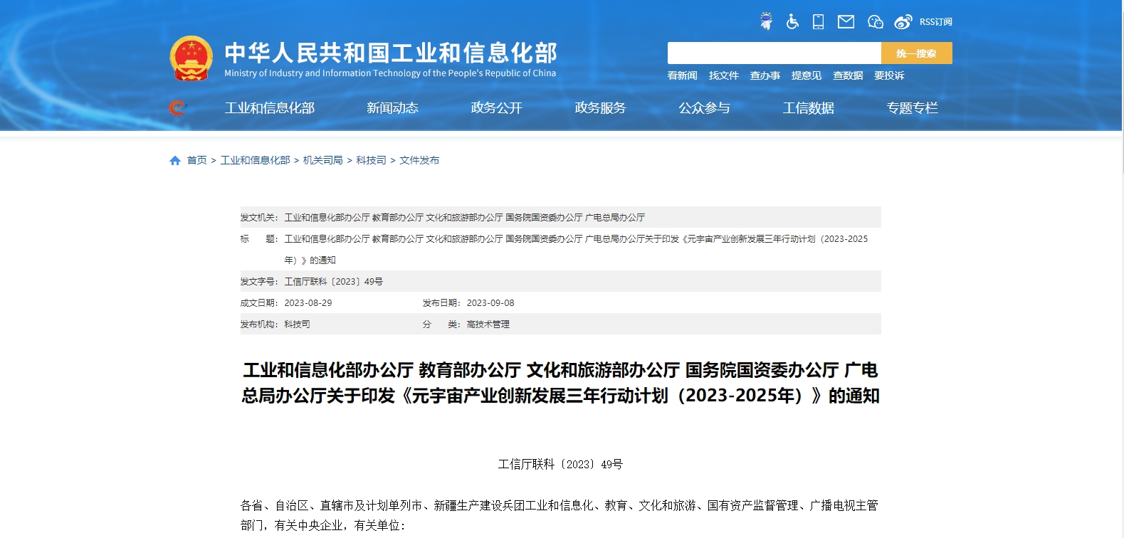 9月8日,工業(yè)和信息化部辦公廳、教育部辦公廳、文化和旅游部辦公廳、國務(wù)院國資委辦公廳、廣電總局辦公廳印發(fā)《元宇宙產(chǎn)業(yè)創(chuàng )新發(fā)展三年行動(dòng)計劃(2023-2025年)》。